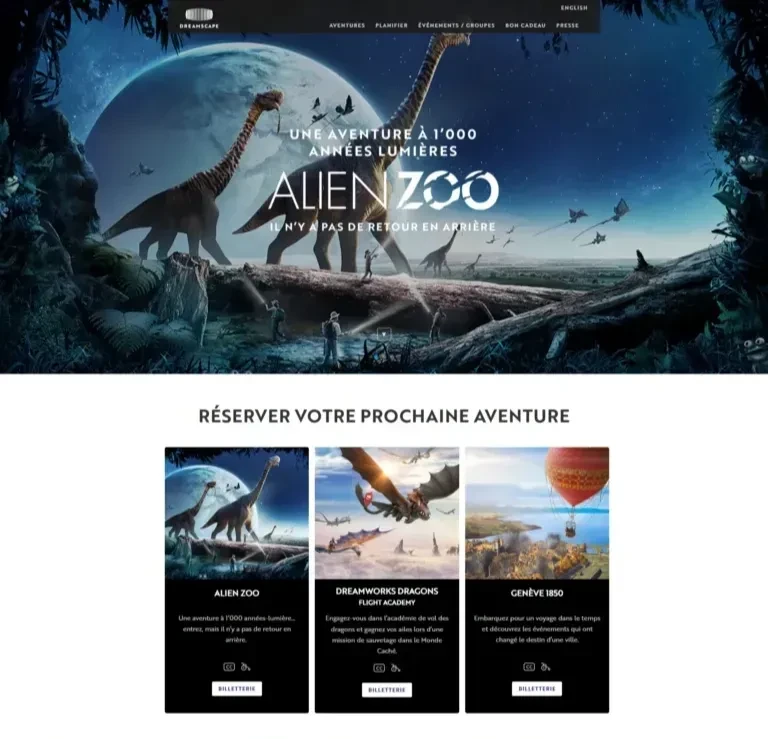 In July 2022, Dreamscape Immersive opened its first virtual reality centre in Europe at the recently renovated Confederation Centre. For this opening, we collaborated on the creation of the website dreamscapegeneva.com, the official site and ticketing platform for Dreamscape Geneva, as well as the creation of dynamic displays present in the reception area and lounge.