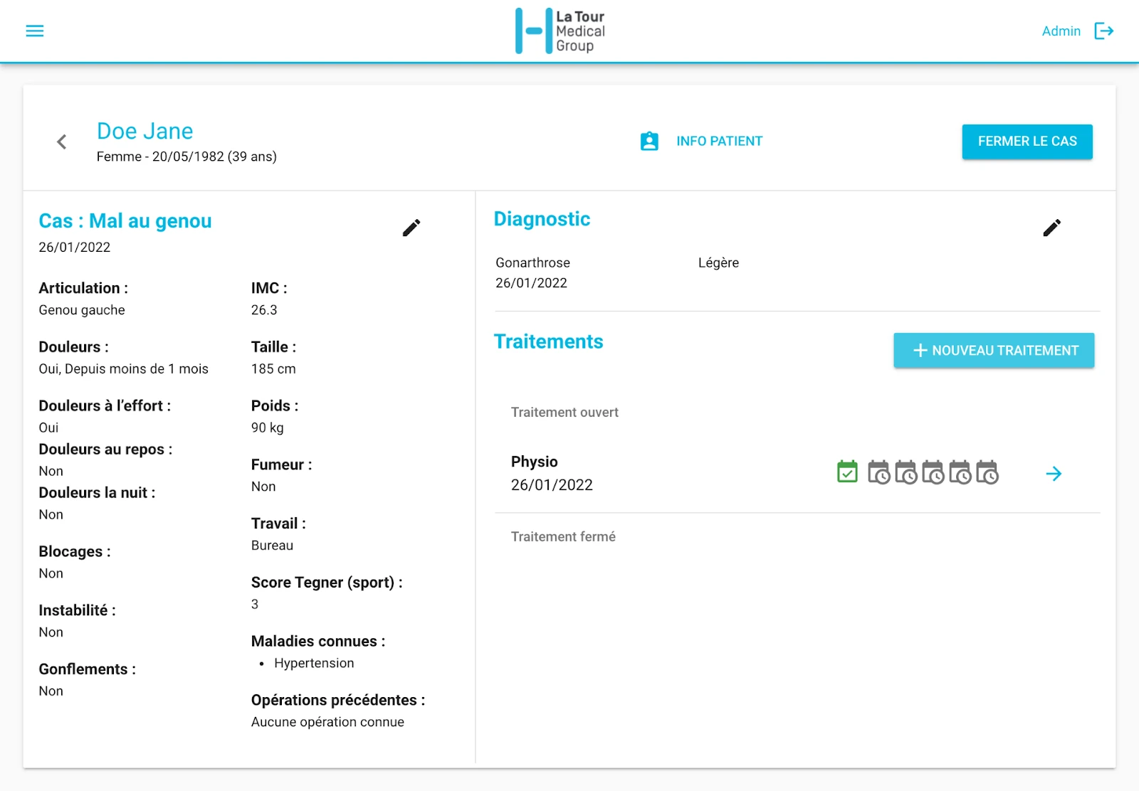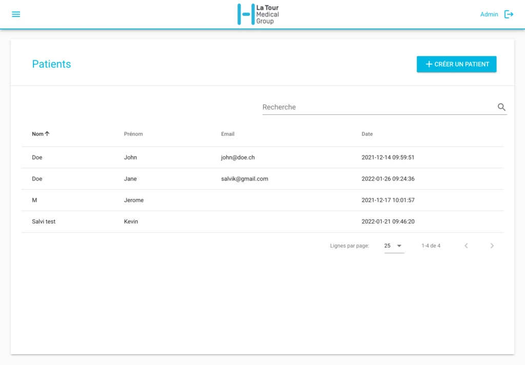 Furthermore, this tool provides the centre with a medical database with a dual purpose: - To improve the care of its patients in order to enhance their well-being - To collect qualitative data to support the centre's medical research Hôpital La Tour has commissioned us for this project, and we have taken responsibility for the development of the solution.