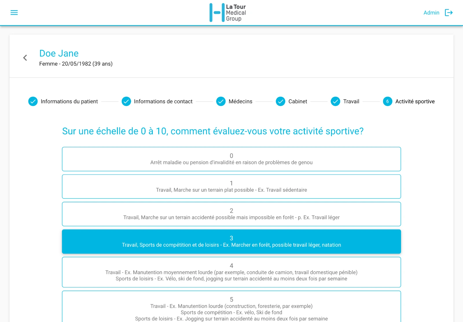 Upon registration, the patient provides their personal information, but must also answer a question regarding their sporting activities. The response to this question will establish a "score" for the patient, known as the Tegner score, which allows the medical team to provide better care for their patients.