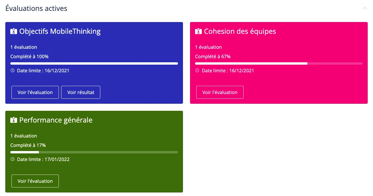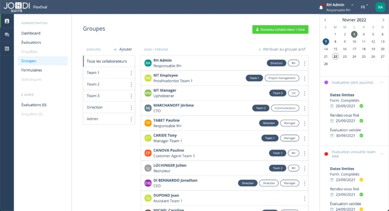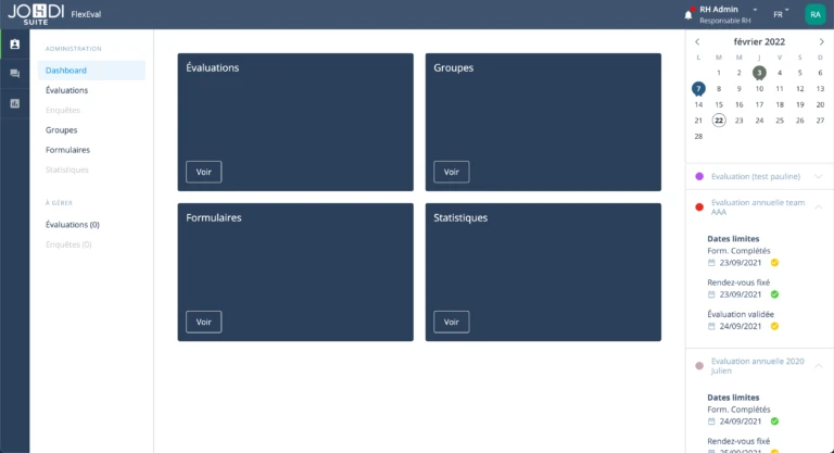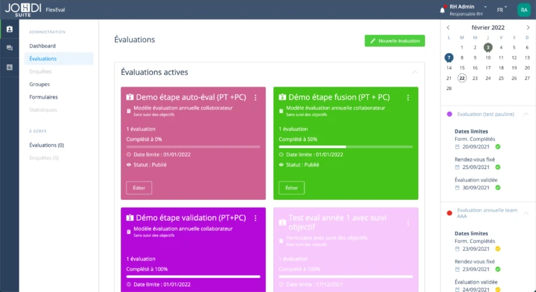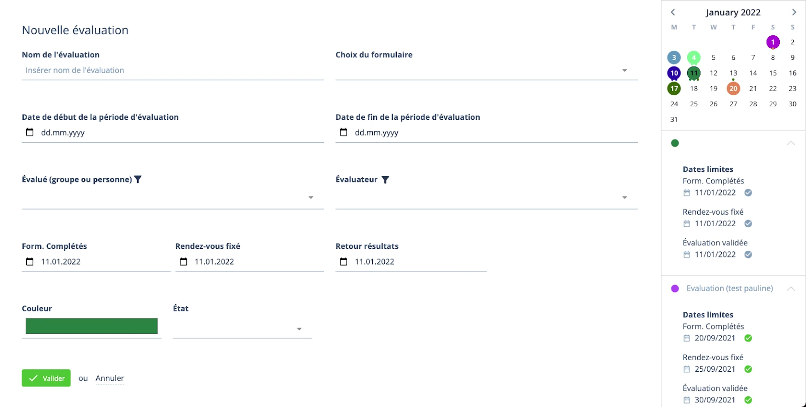 The individuals concerned by the evaluation, evaluators and those being evaluated, will receive a notification via email inviting them to review the evaluation and complete it before the specified deadline. Assigning a colour and a deadline to the evaluation will allow HR to easily keep track of upcoming events through the calendar located at the top right.