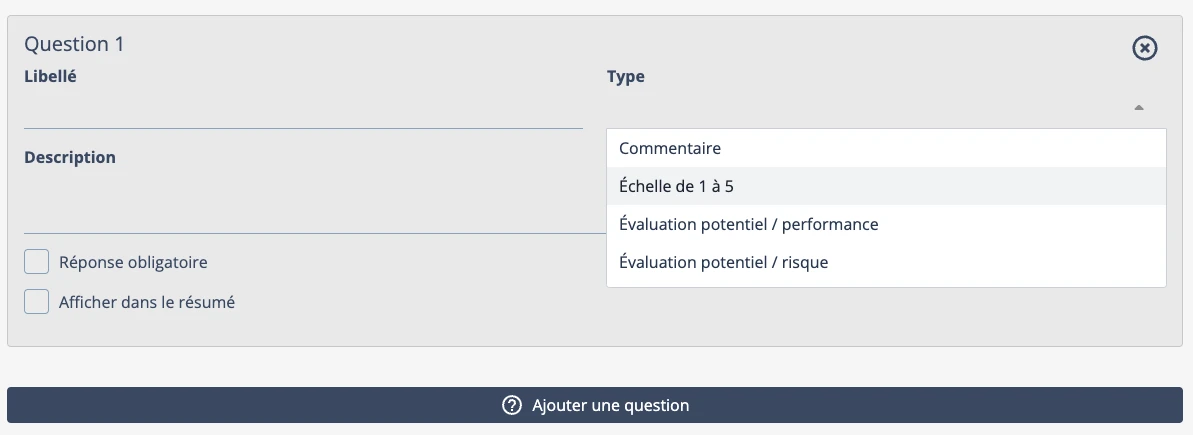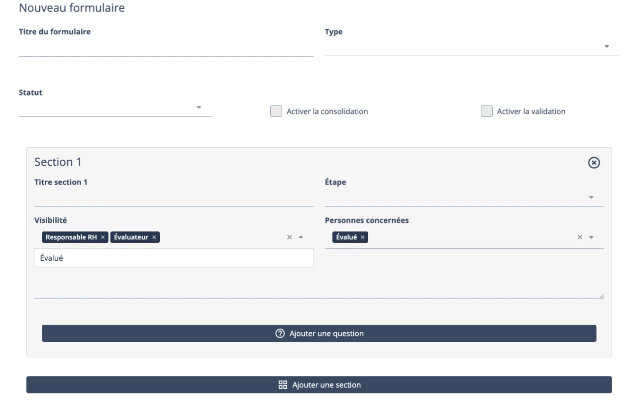 With the Eval tool, human resources can create forms that are used to generate assessments. Depending on the purpose of the form, HR can determine whether the assessment requires a consolidation between the evaluator and the assessed individual, and if the assessed individual must validate the final scores of the assessment before submission. A form is composed of sections, which may be visible or hidden depending on the HR's choice. Each section comprises questions created as follows. Once the form is created, it can be assigned to an assessment at the time of its creation.