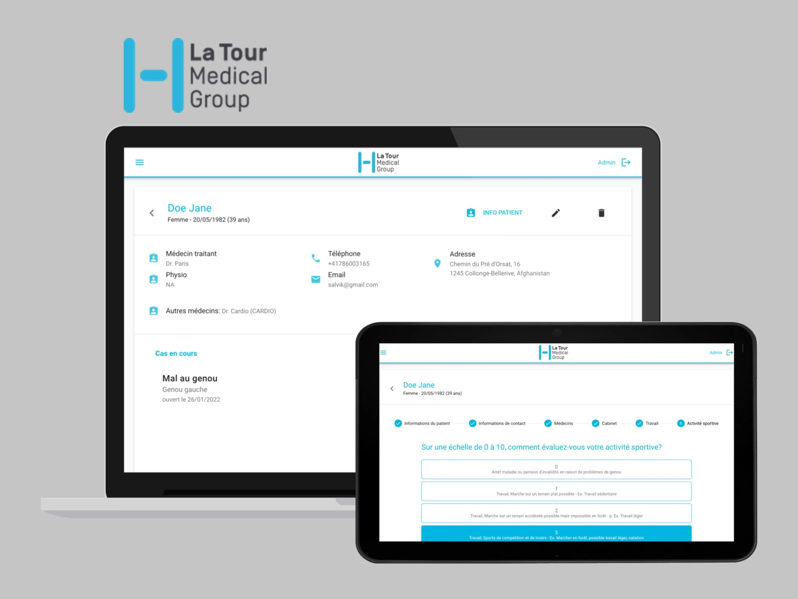 Le Centre du Genou Genève, via l'Hôpital La Tour, a chargé MobileThinking de créer une solution pour évaluer les patients à l'aide de questionnaires pré et post opératoire sur le long terme. Ces questionnaires, conçus par des scientifiques, génèrent des scores pour chaque patient en fonction de ses réponses, facilitant ainsi la prise en charge médicale.