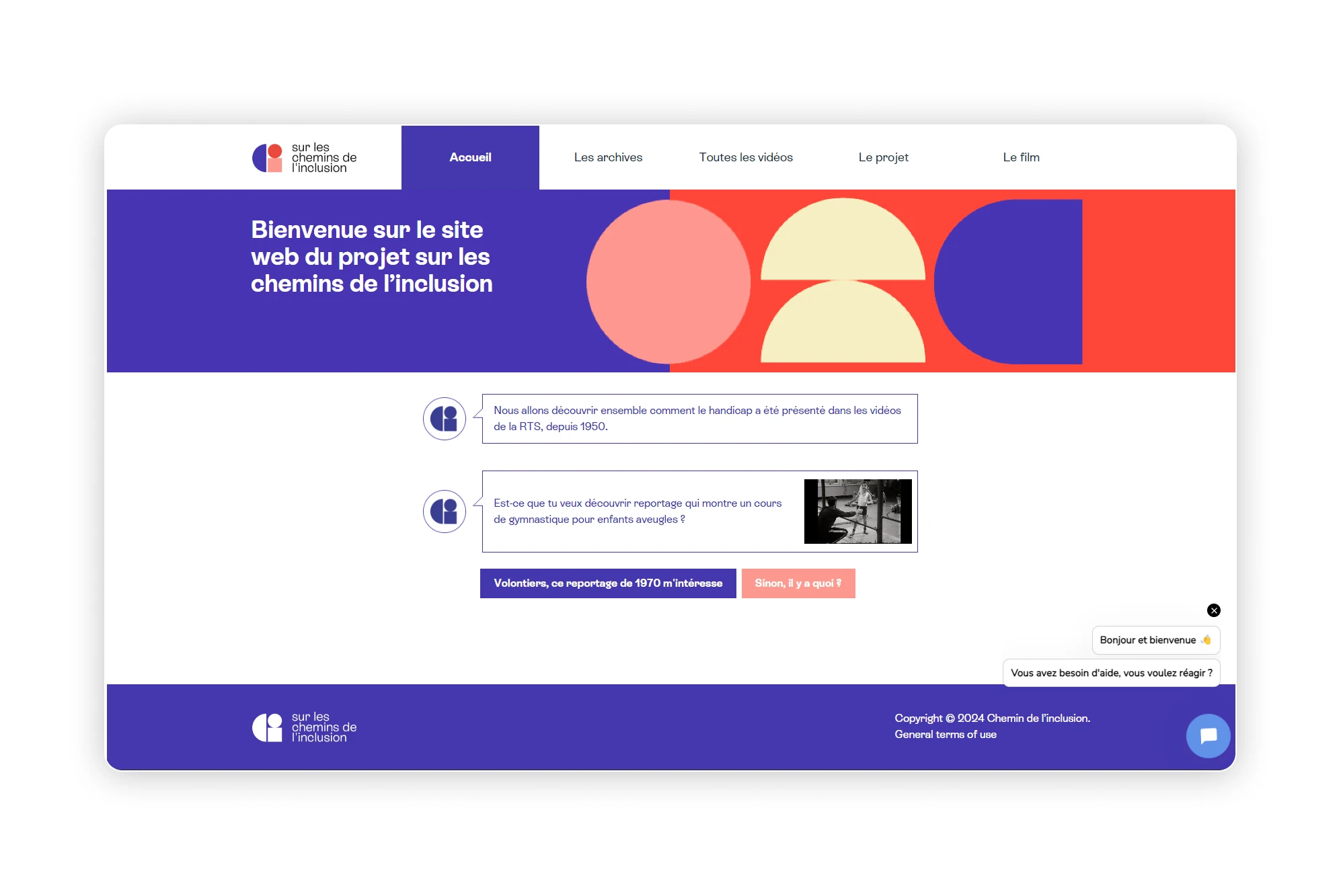 Nous avons utilisé les données d’Airtable pour répondre aux besoins du client, bien que cela représente un défi technique lié à la permissivité de l’outil. Lors de la conception, nous avons hiérarchisé et clarifié la navigation entre les différents types de médias (archives RTS, extraits, etc.). Nous avons également intégré un chatbot interactif sur la page d’accueil, ainsi qu’un système de chapitrage dynamique dans les vidéos YouTube et Vimeo. Ces fonctionnalités améliorent considérablement l’expérience utilisateur.