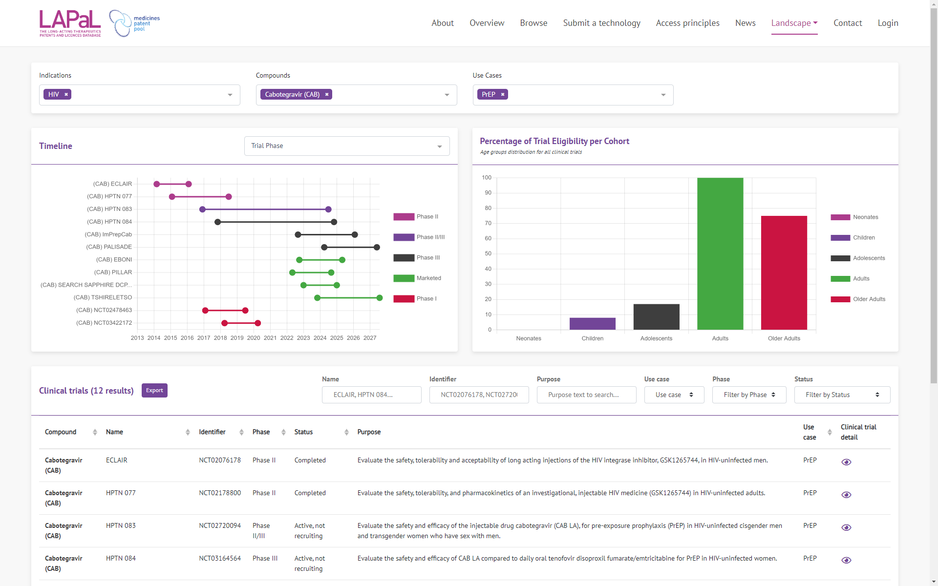 Les essais cliniques pour les technologies ainsi que pour les composés pharmaceutiques (appelés « compounds » dans LAPaL) ont été ajoutés dans une mise à jour antérieure, mais présentés sommairement sous la forme d’un tableau dans les pages de détails. Nous avons ajouté une page dédiée aux essais cliniques pour présenter sous la forme de graphique, le ou les essais cliniques pour un ou plusieurs compounds / technologies. Un 1er graphique présente sous la forme d’une ligne de temps les périodes actives de ces essais cliniques et un 2ème présente les tranches d’âges concernés par les participants.