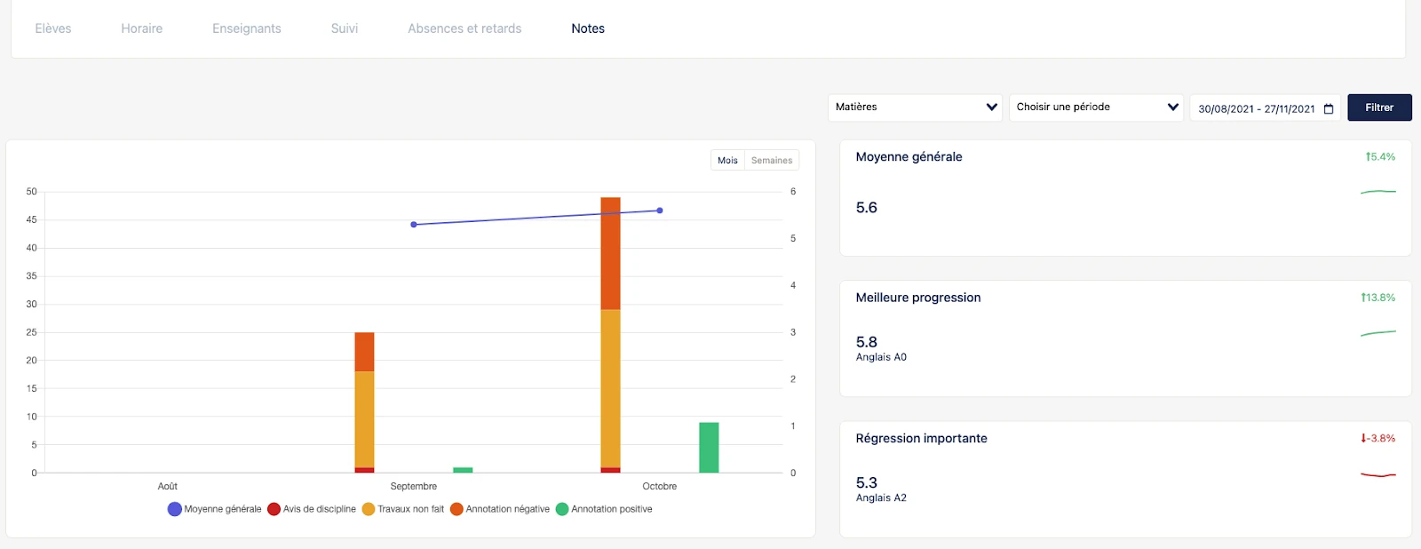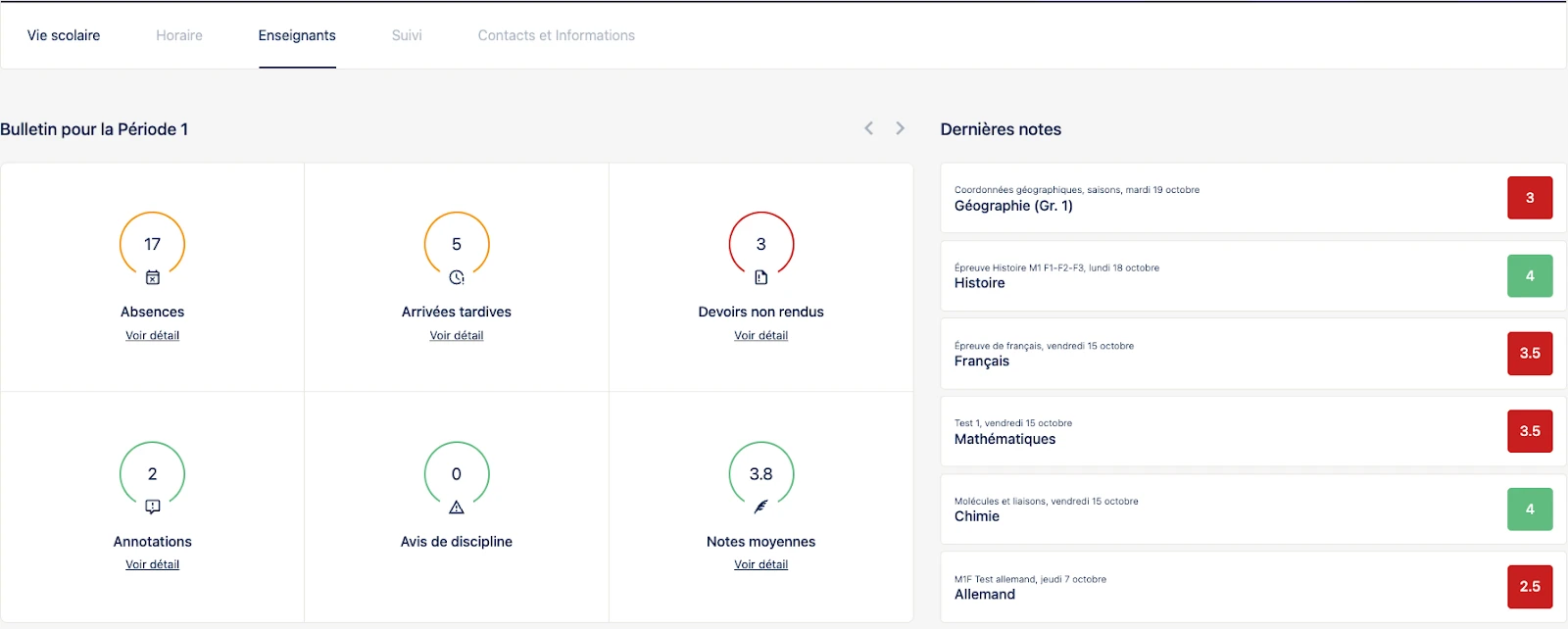 Ou encore, voir pour chaque élève ses notes et appréciations.